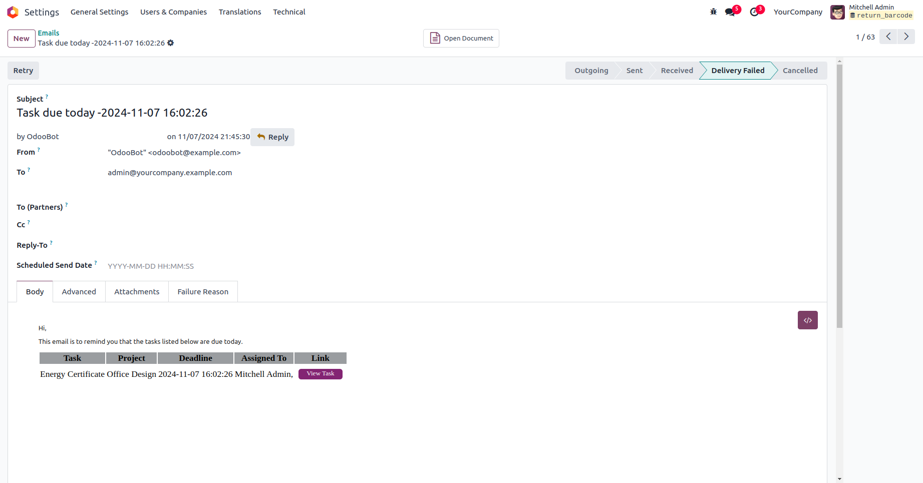 Send auto reminder mail to responsible user of task if the deadline is today.