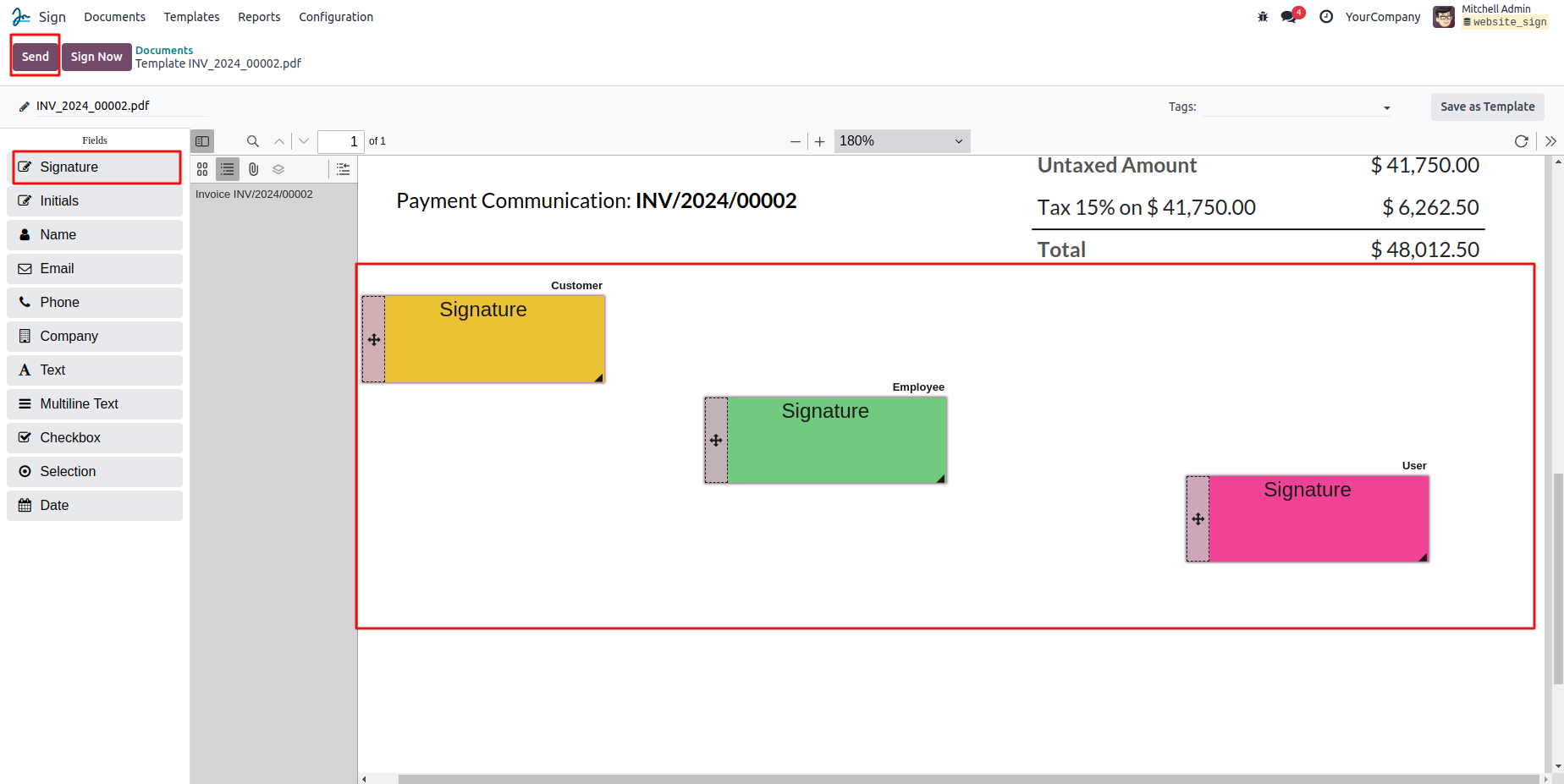 Drag and drop the Signature field into the PDF then set the signers and SEND it.