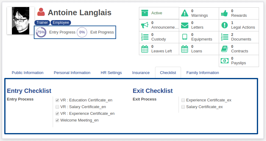 A person has to undergo all configured checklist items before being admitted/resigned. Corresponding Percentpie will be shown in employee form view.