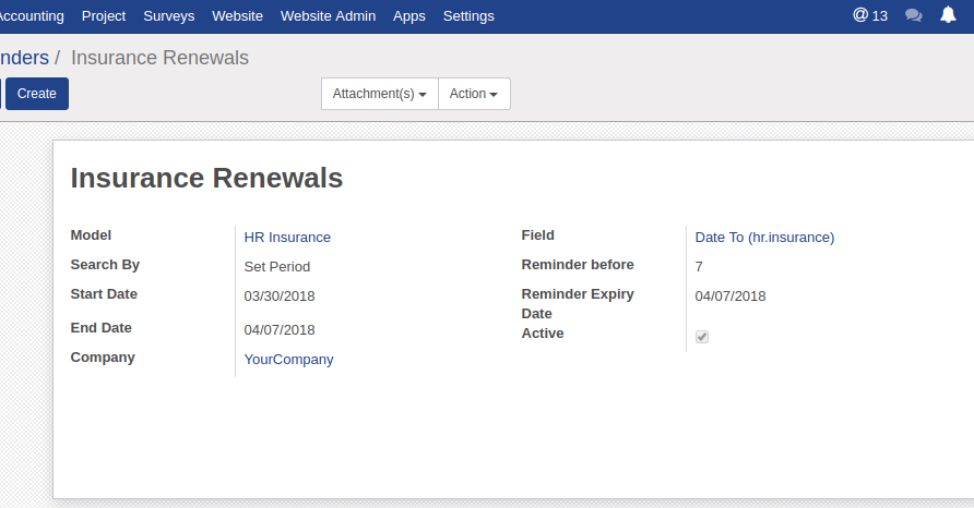 Reminder sets alarm to recall every important dates. 'Bell' symbol beside the chat icon will bring your reminder pop ups. You can set reminders to any model (eg: Sales,HR,Project etc..) and also their corresponding date fields to compare. Eases company to memorize the special dates.