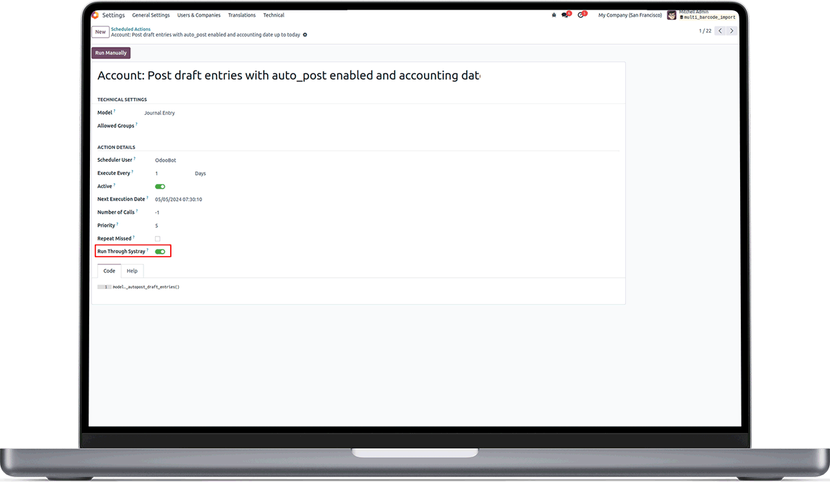 Enable the boolean field to run scheduled actions through systray, Only enabled scheduled action are shown on the systray.