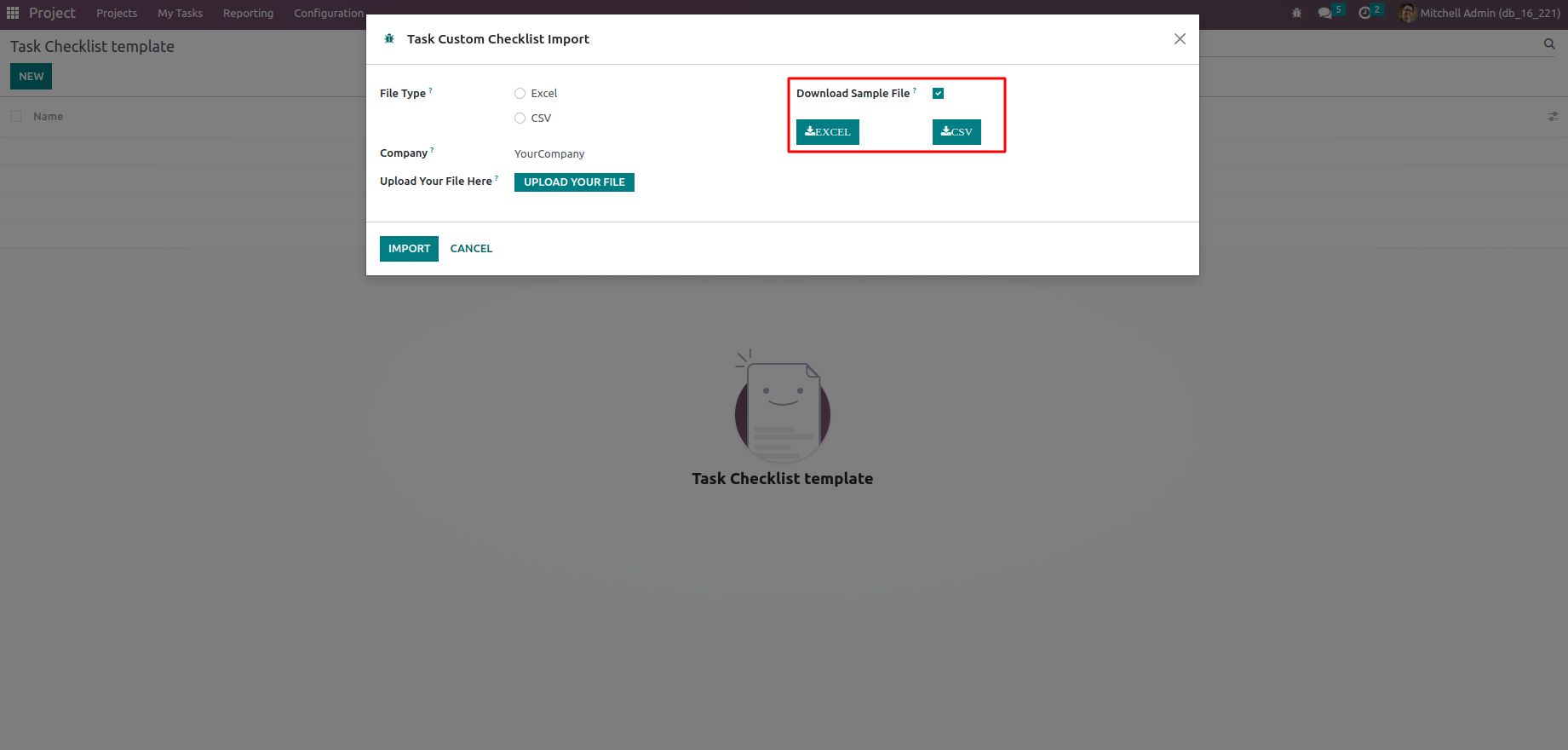 Click on the task custom checklist import menu we can see the wizard is open We have the option to import excel and csv files, and we can download sample file for importing