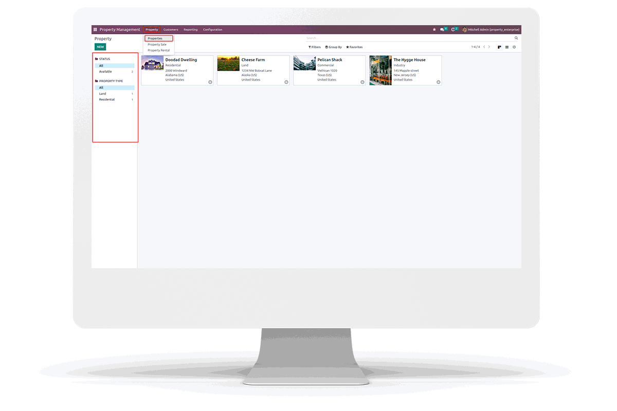 When you open the menu 'Property Management', you can see all the properties in different views such as kanban(by default), tree and activity. You can also use the search panel to filter among different property type and their status. You can create a property by clicking on the create button at the header