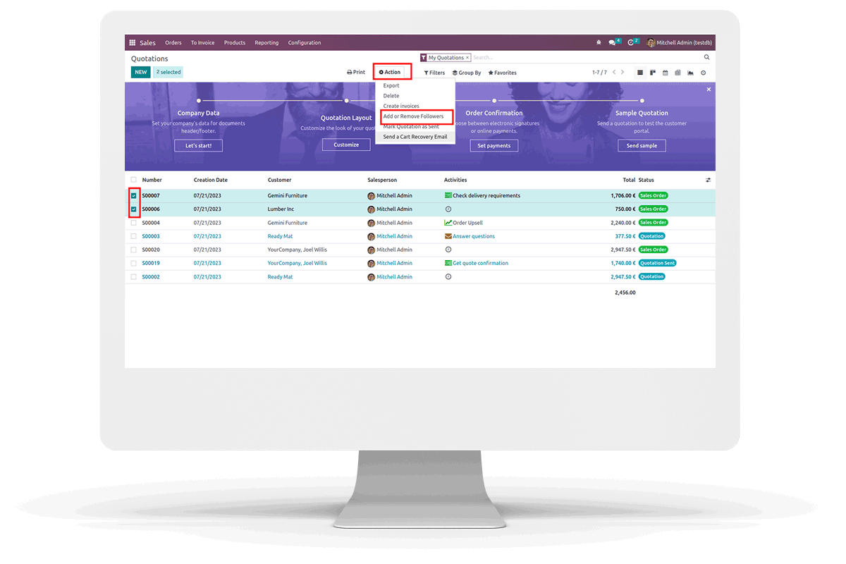 Action applied in the selected model. Select the order line in which you want to Add/Remove Multiple Followers, then go to Action and click on that Action.