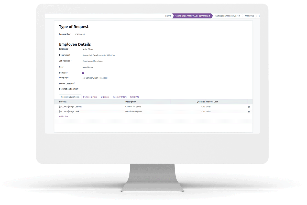 This module allows your employees to send requests to the Department Manager of Equipment for equipment type as equipment requests and equipment damage expense reimbursement requests.