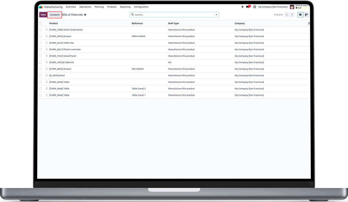 Go to Products -> Bill Of materials -> We can See The Compare button in Tree View