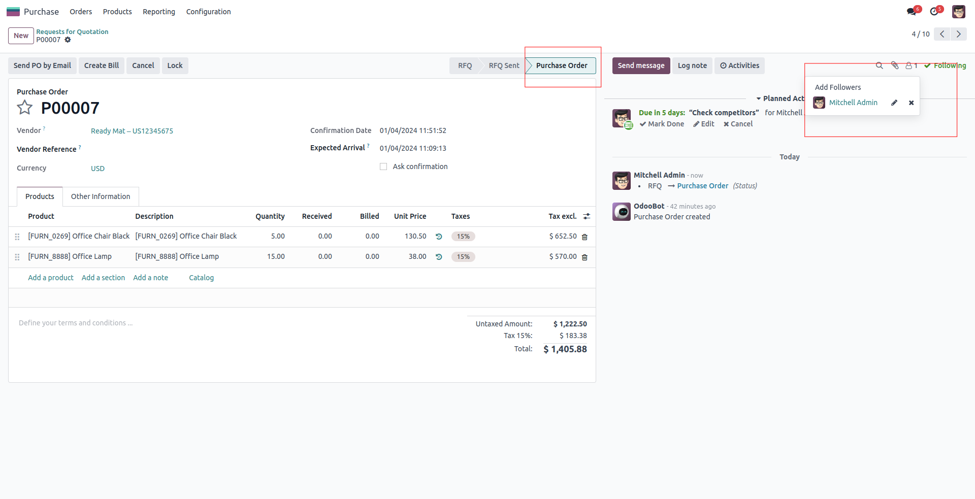 While confirming a Purchase Order, we can see that only the user is added to the follower. Here the vendor is restricted to be a follower.