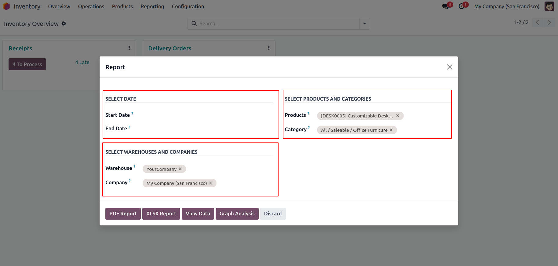 When click on the menu it will show a wizard for select start date, end date, products, categories, warehouses and companies. If we not select anything it will give all records. We can select necessary domains for filter records. Set default values in fields. We have PDF Report, XLSX Report, View data and Graph analysis buttons for generate reports.
