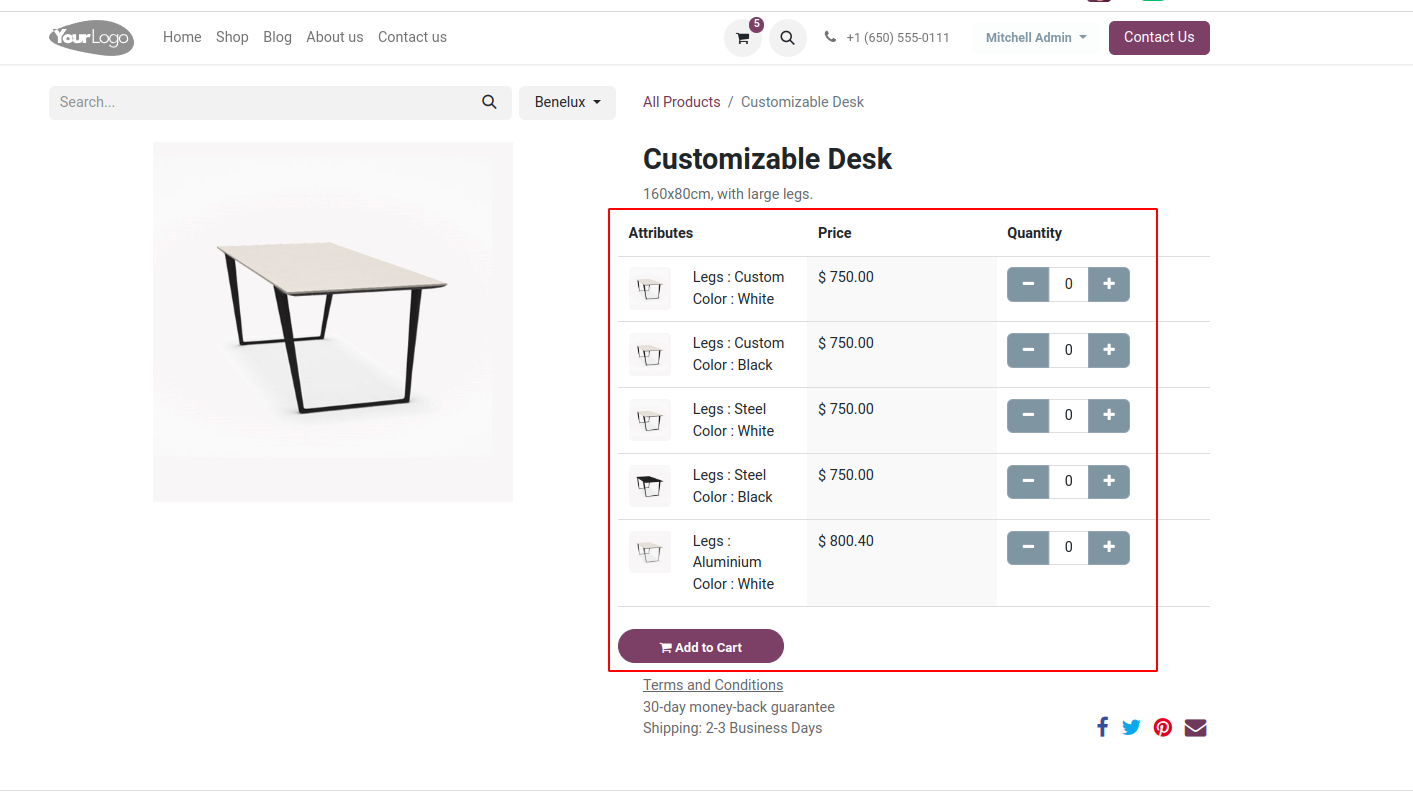 Product variants are displayed in a tabular format on the product page with a quantity field.