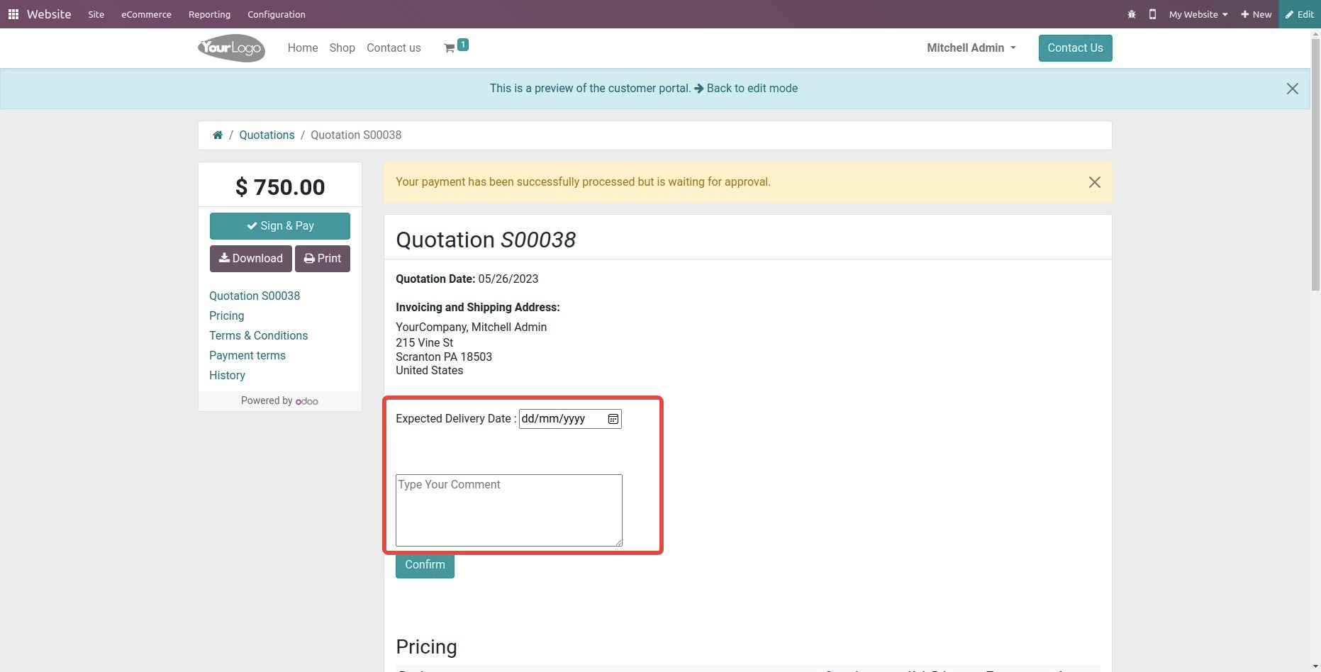 User can enter the delivery date and comments.