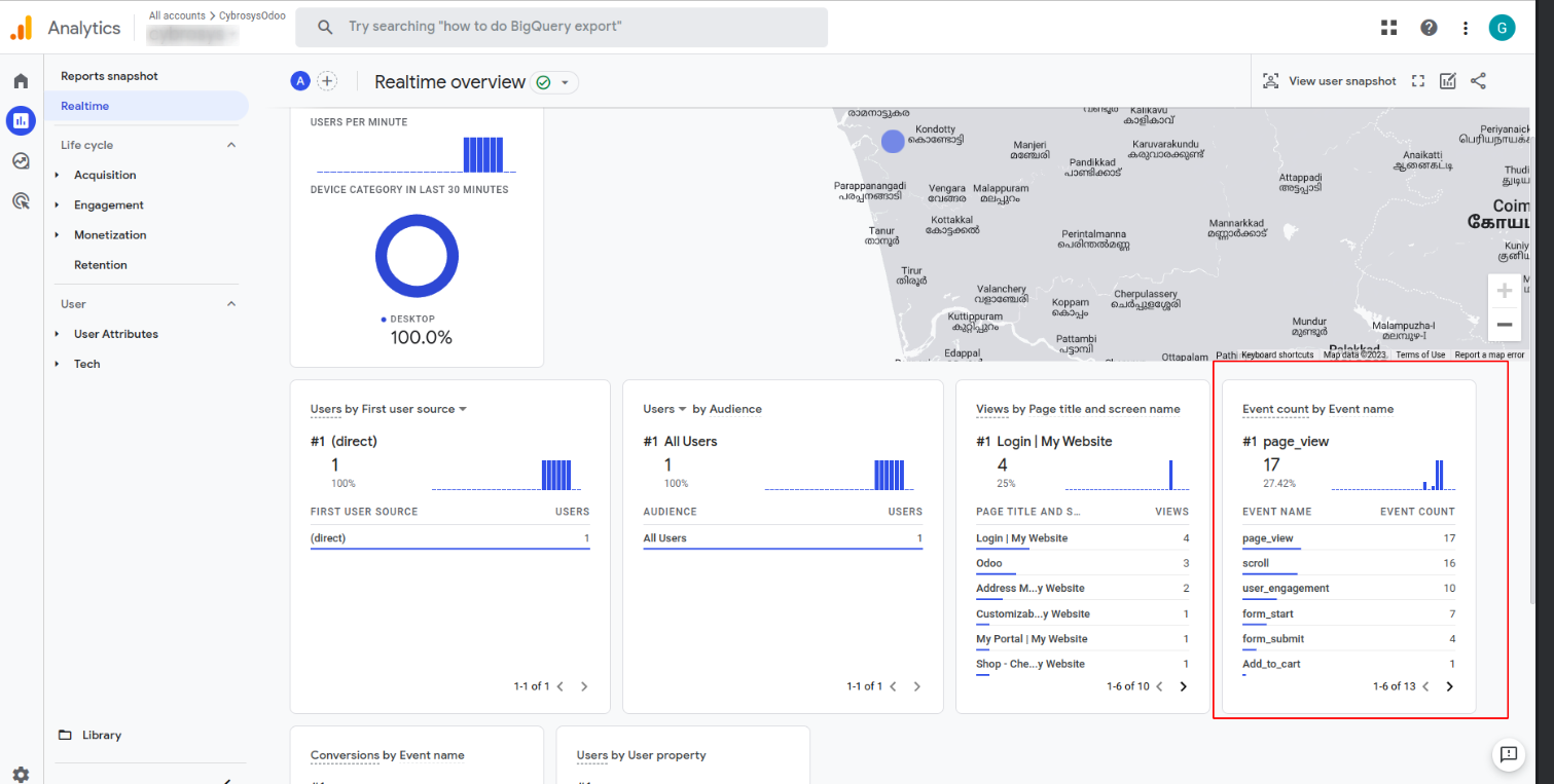After performing certain actions in the Odoo backend, like confirming a sale order, purchase order, or invoice, and also when users add products to the cart or wishlist on the website, or when they log in or sign up, you can view these events in real-time using Google Analytics.