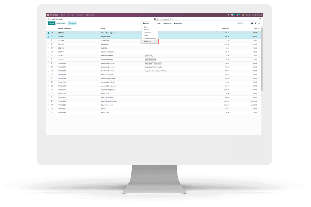 Added Create RFQ option inside Action button of Products Variants list