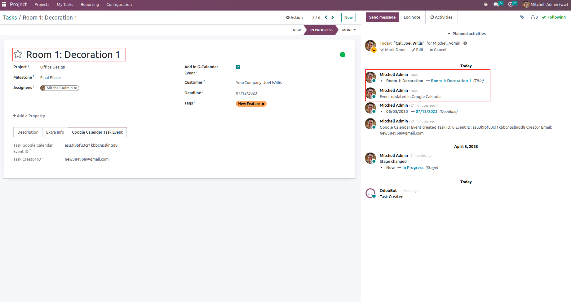 On updating project task like user, customer, name, description, deadline, due date etc., google calendar event also changed. also can see in chatter its status
