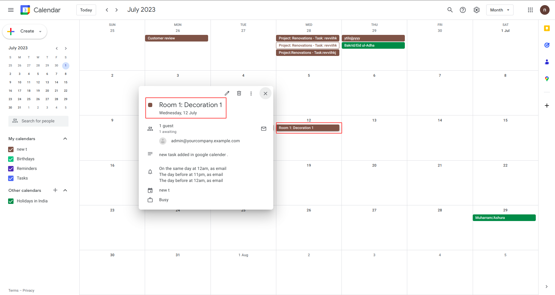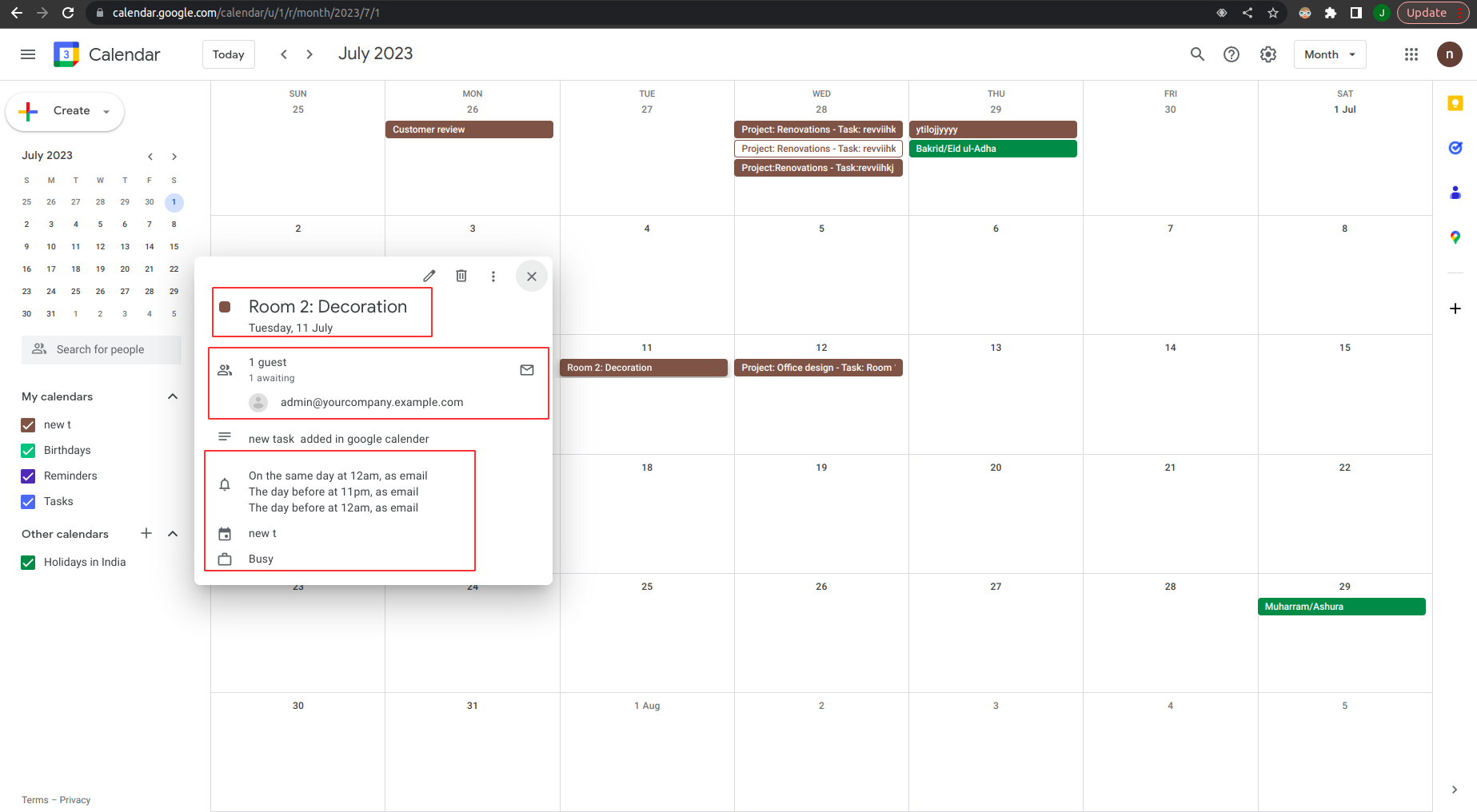 On clicking google calendar event user can also see all task details like project and task name, create date and time, attendee, description, and user.