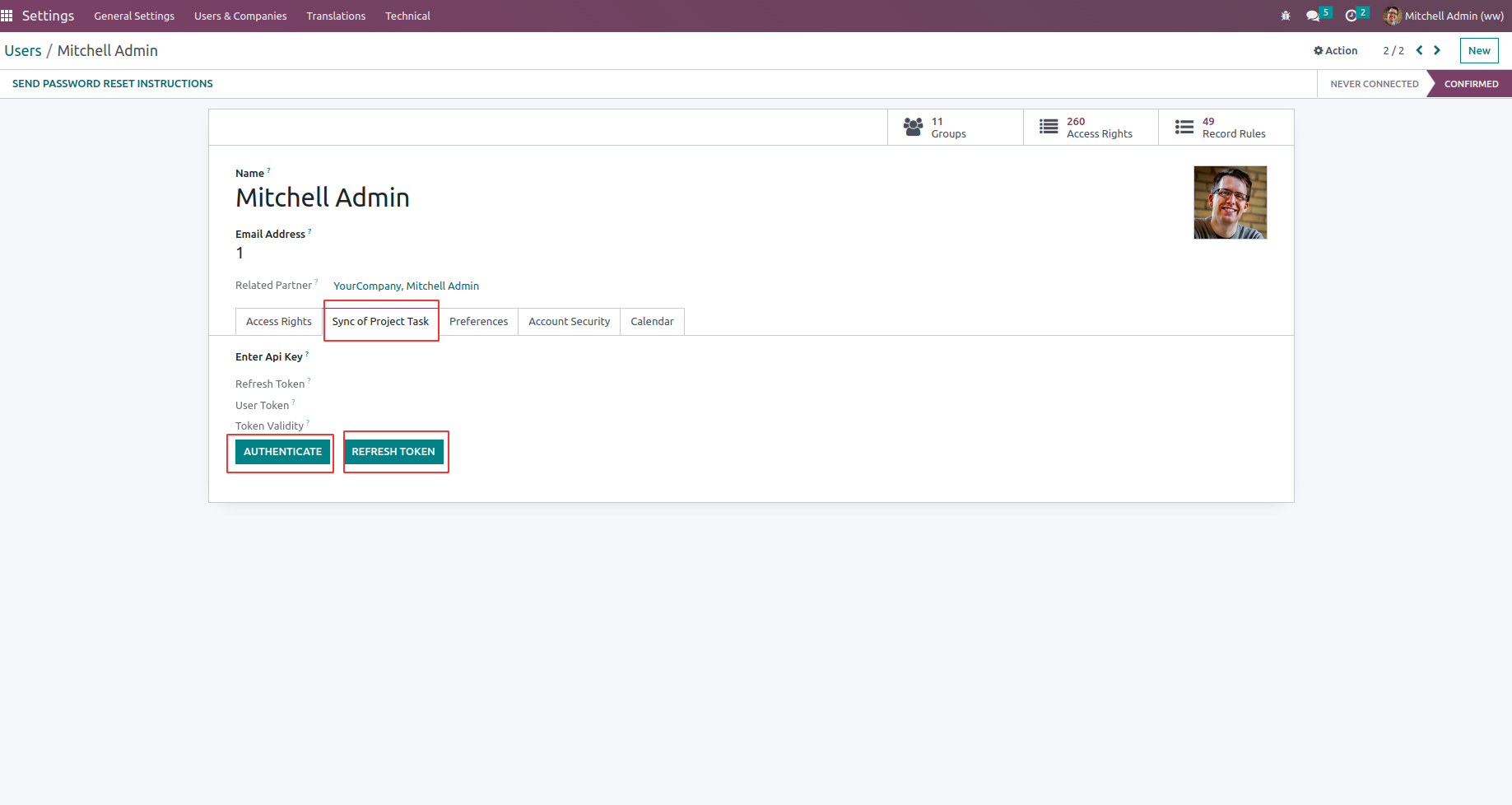 Under Settings > Users and Companies > Users menu under "Sync of Project Task" tab user need to click "AUTHENTICATE" button.