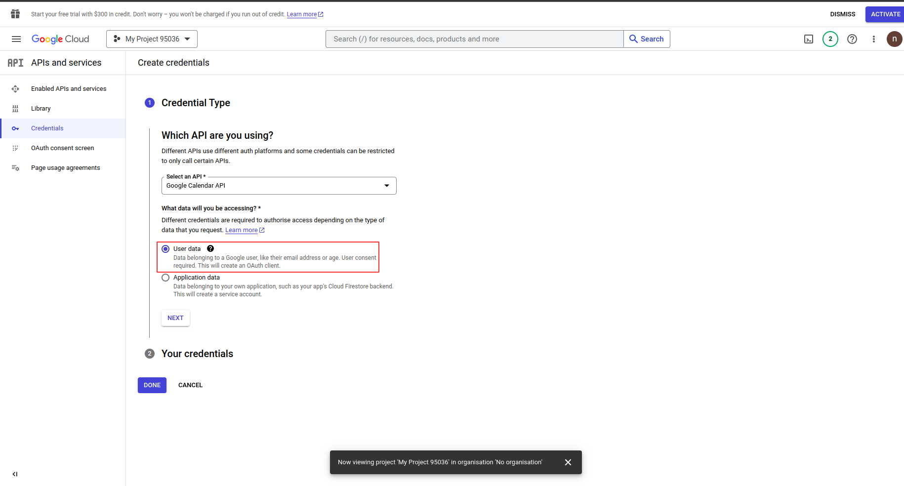Select "Google Calendar API" as api and "User Data" as data accessing and click "Next"