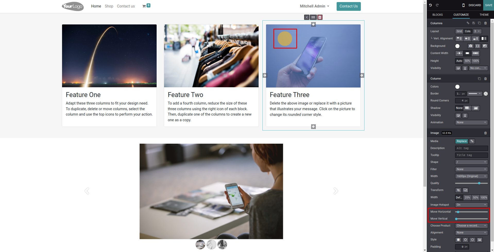 Adjust the horizontal and vertical positioning of image hotspot to place it in desired position using the "Move Horizontal" and "Move Vertical" snippet options