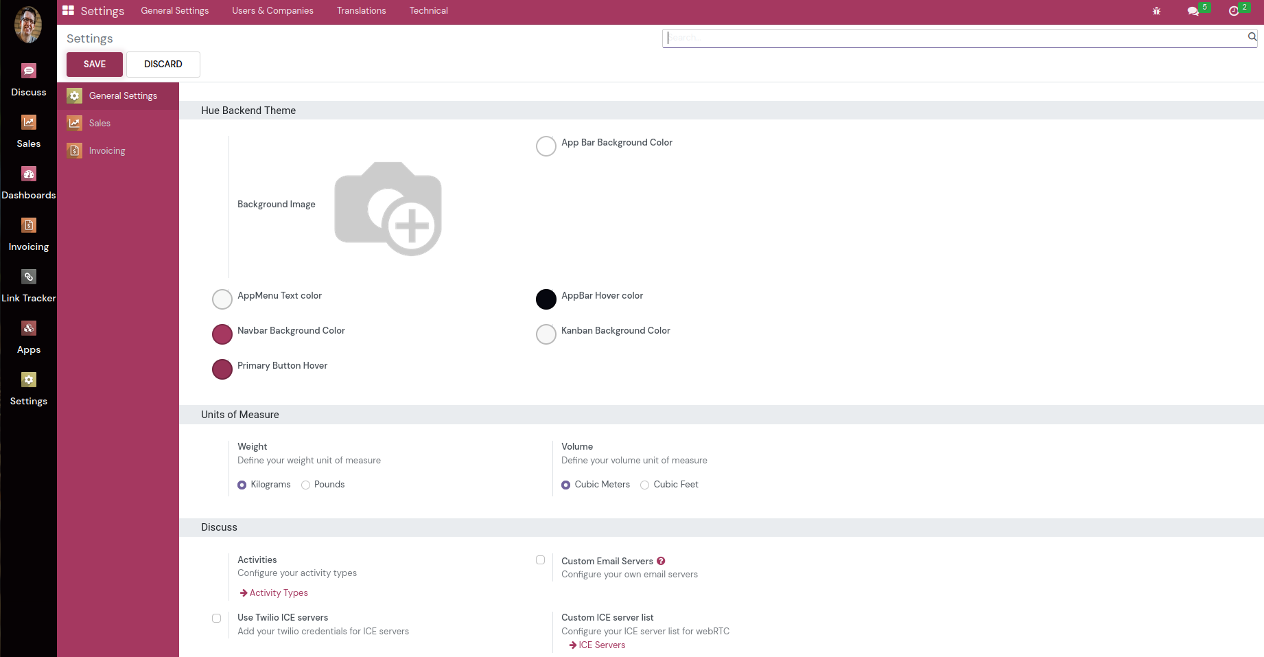 To improve your experience with Odoo the Hue backend theme provides a fully configurable theme settings menu.