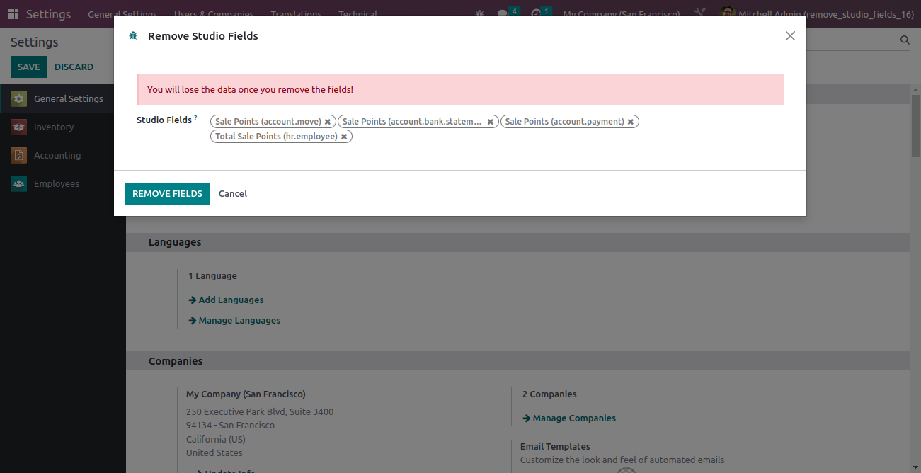 Once you delete a field, you will lose the data stored with that field. So, ensure that you don't need the data anymore. Else, backup or store the data before deleting the fields. Click on the button 'REMOVE FIELDS' to delete the selected fields.