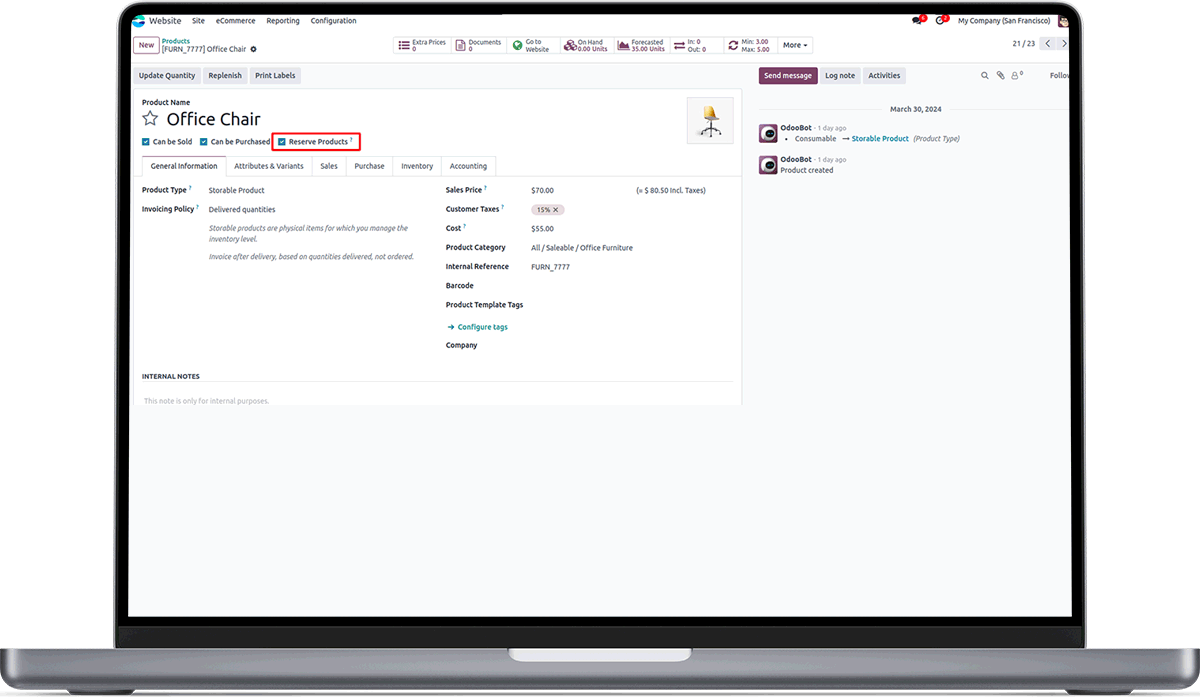 By enabling the 'Reserve Products' checkbox inside the product, the item can be reserved.