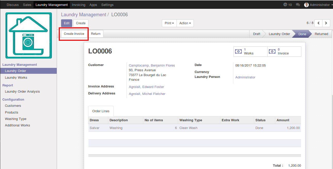 ☛ When you install this module, an extra menu Laundry Management will created in main menu. You can see the different sub menus under the main menu. Here you can create Laundry Order via clicking the 'Create' button. There you can specify the customer, laundry person, order lines with washing type and Extra works for your order.