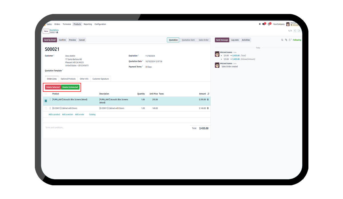 When we select a order line we can see two buttons Delete Selected and Delete UnSelected