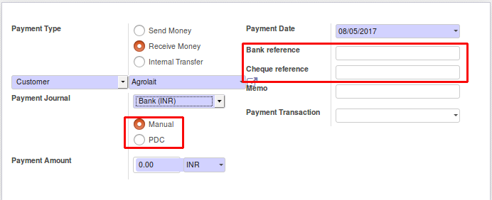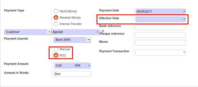 As shown here, You have to select PDC to enable the PDC payment.This is only available with Journal of type 'Bank'