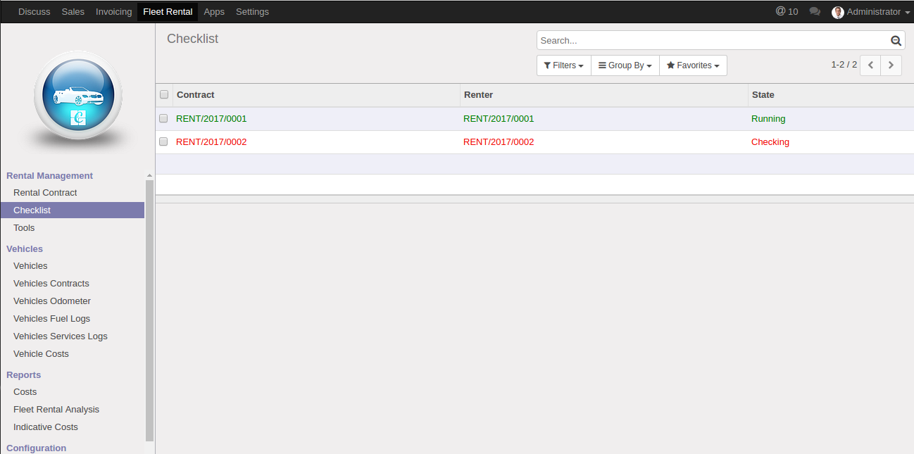☛ When you install the module, an extra menu named Rental Management is created under the Fleet Menu. Also "Fleet" menu is replaced as "Fleet Rental". Here you can see different color codes according to each state. This helps you in finding out contracts easily.