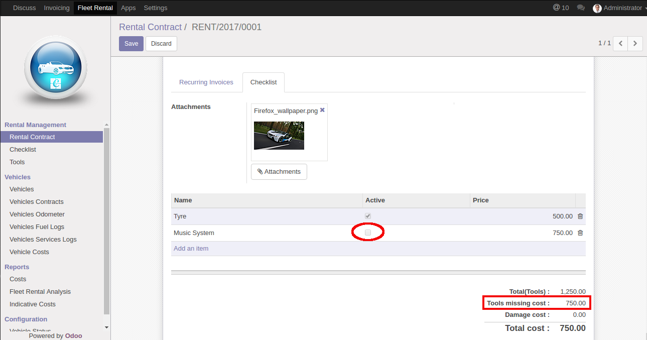 Here you can add the list of tools given with the vehicle. When the vehicle is returned back, the checklist can be validated and helps you to identify the tools that are not returned. The price of unreturned tools will be added to the missing tool cost. The renter have to pay that amount and you can also add damage cost if any. Check the damages by using the images of vehicle uploaded before the contract.
