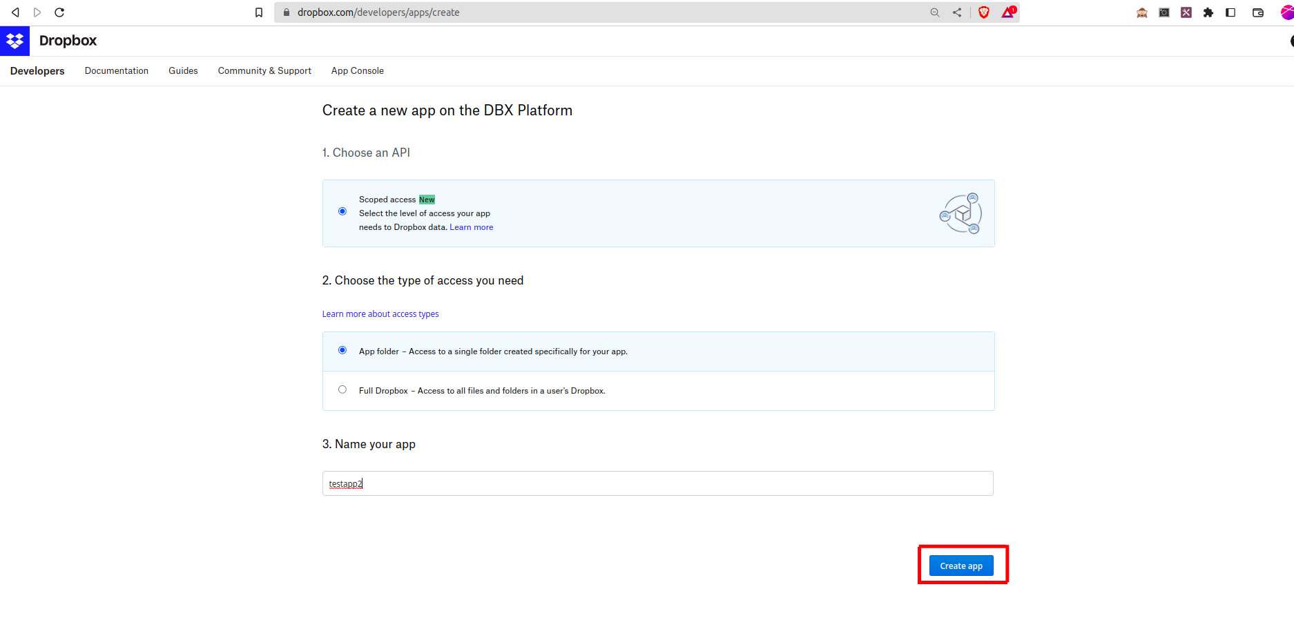 Register the app on Dropbox Developers page