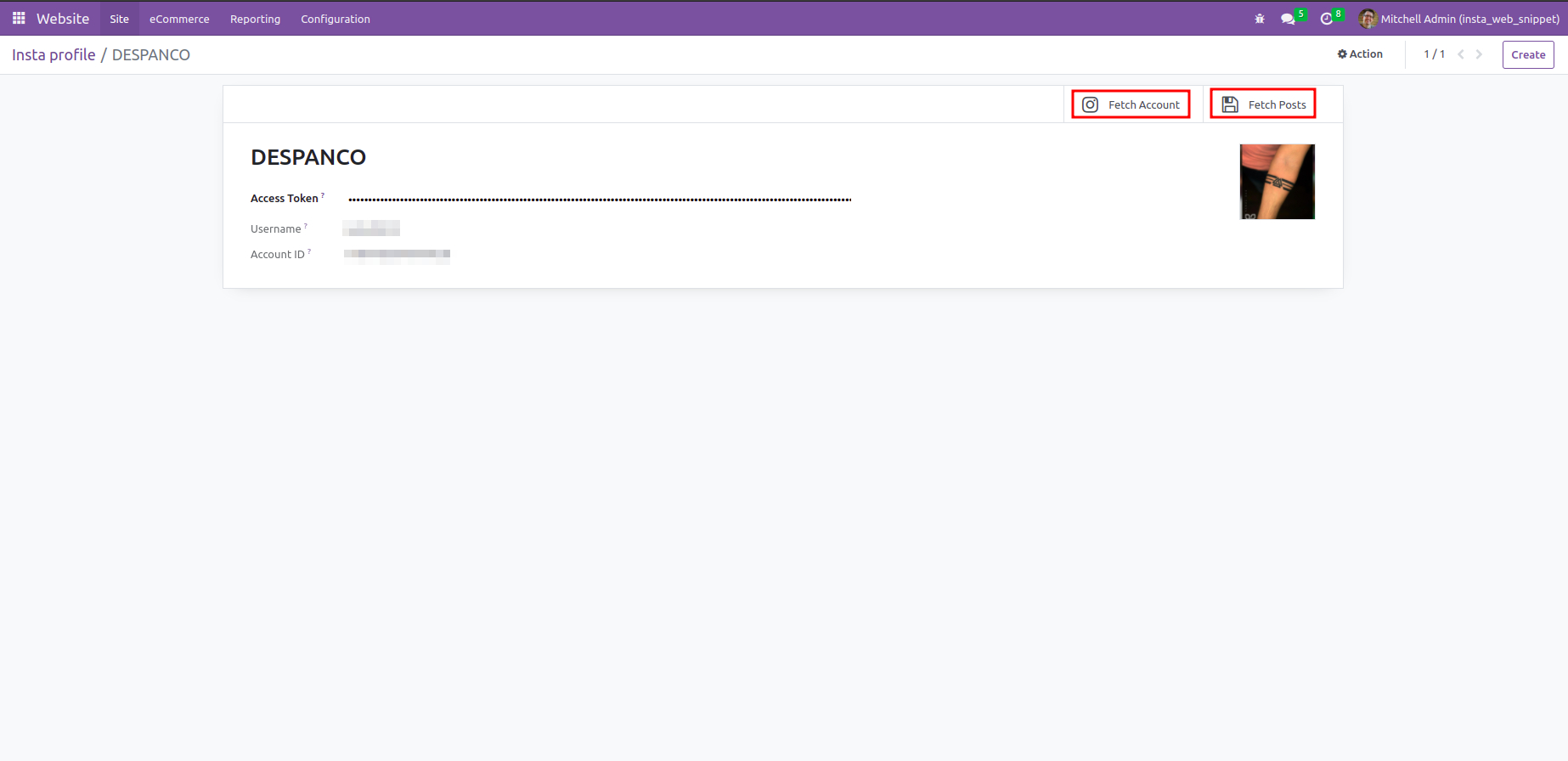 Once the installation is completed, visit the Odoo website app from the backend. Here, click on Configuration>>Instagram.You can set up your instagram profile by adding access key and click fetch account button.Once the profile is generated click the fetch post button to fetch instagram post into odoo