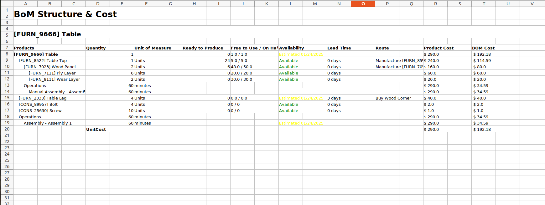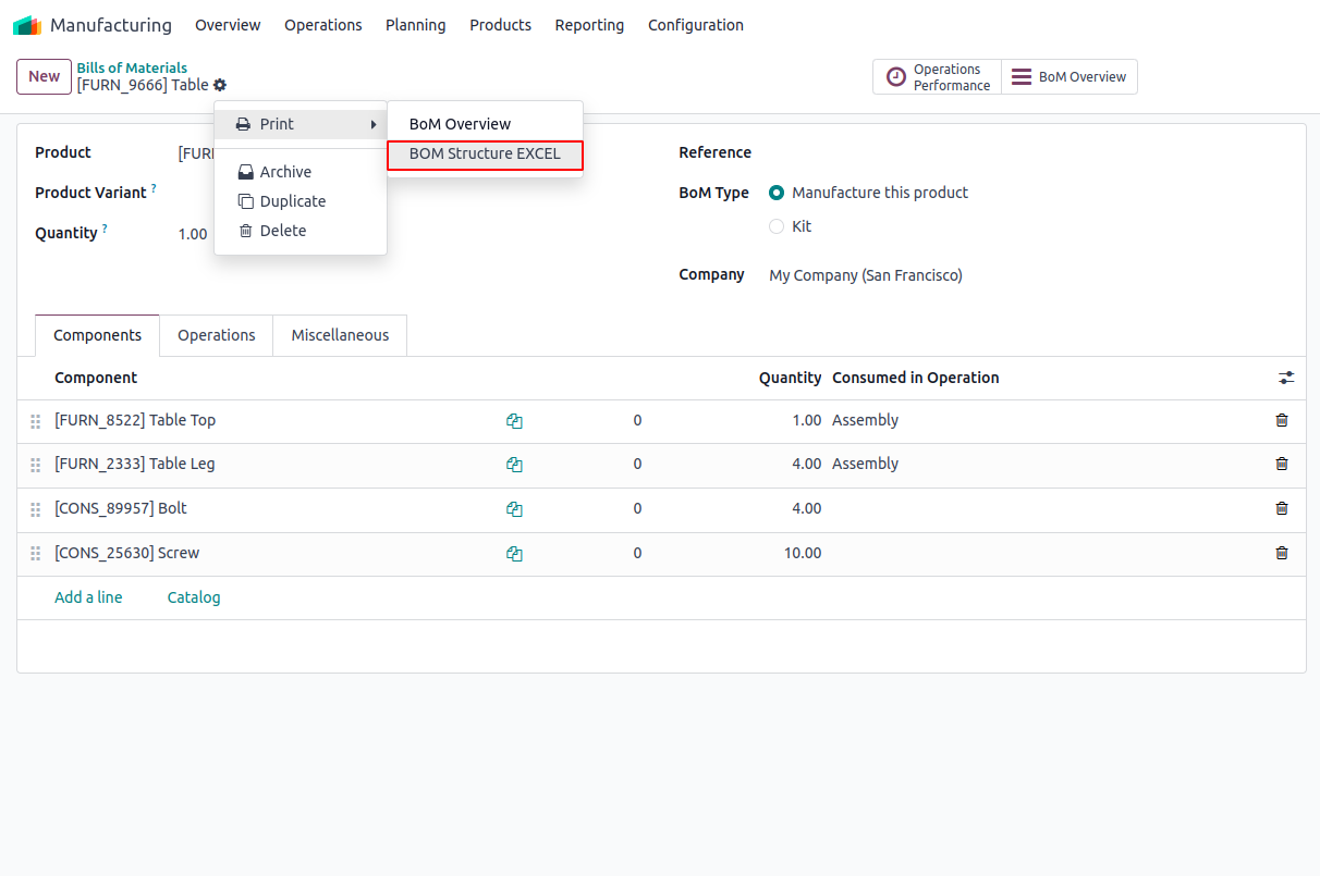 Click on the Print Button and Click BOM Structure Excel to print the Excel Report.