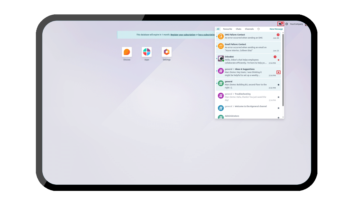 In the Messaging Menu, click the star icon next to a chat or channel. The star turns red when marked as a favourite.