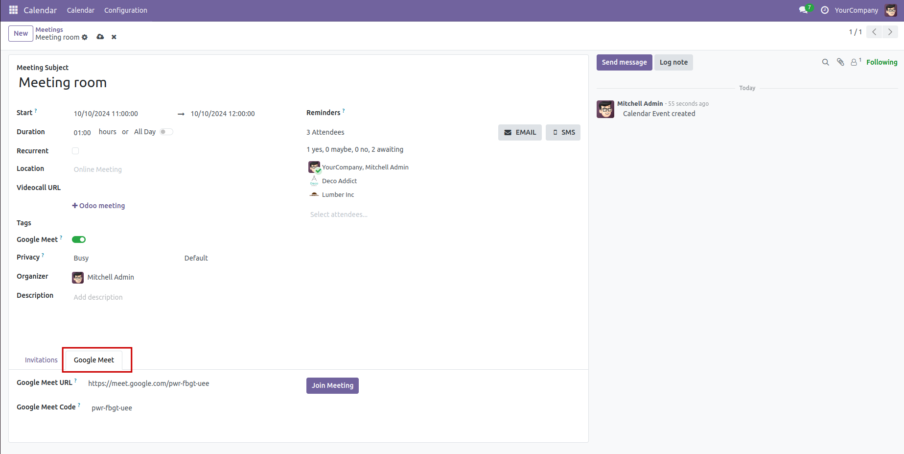 Google Meet Calendar Integration allows to open google meet in odoo.