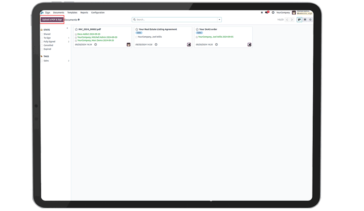 Go to Sign module -> Click the UPLOAD A PDF TO SIGN -> Then upload to a document.