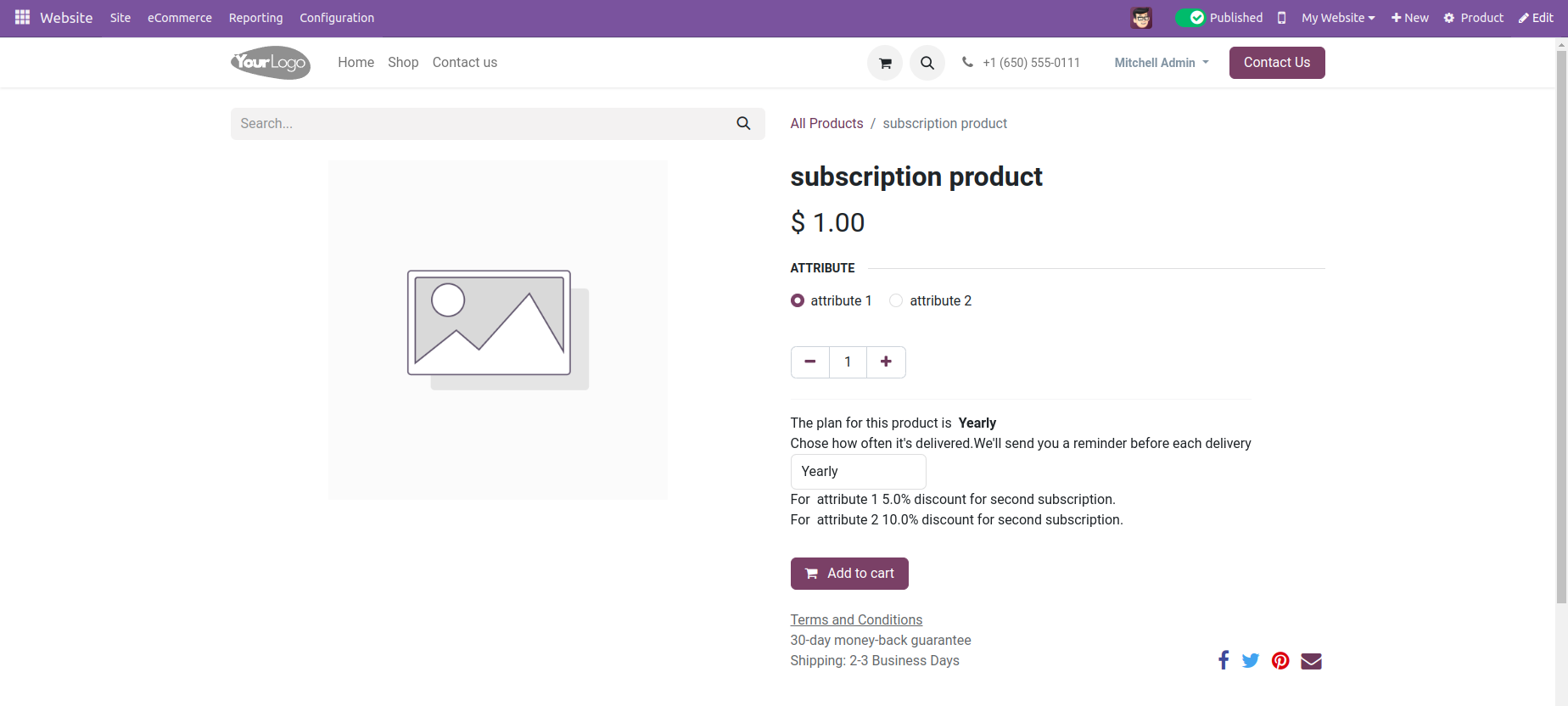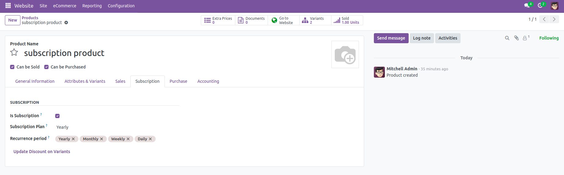 Enable 'Is Subscription' from 'Subscription' tab and provide discount for variants.Select subscription plan and Recurrence Period.