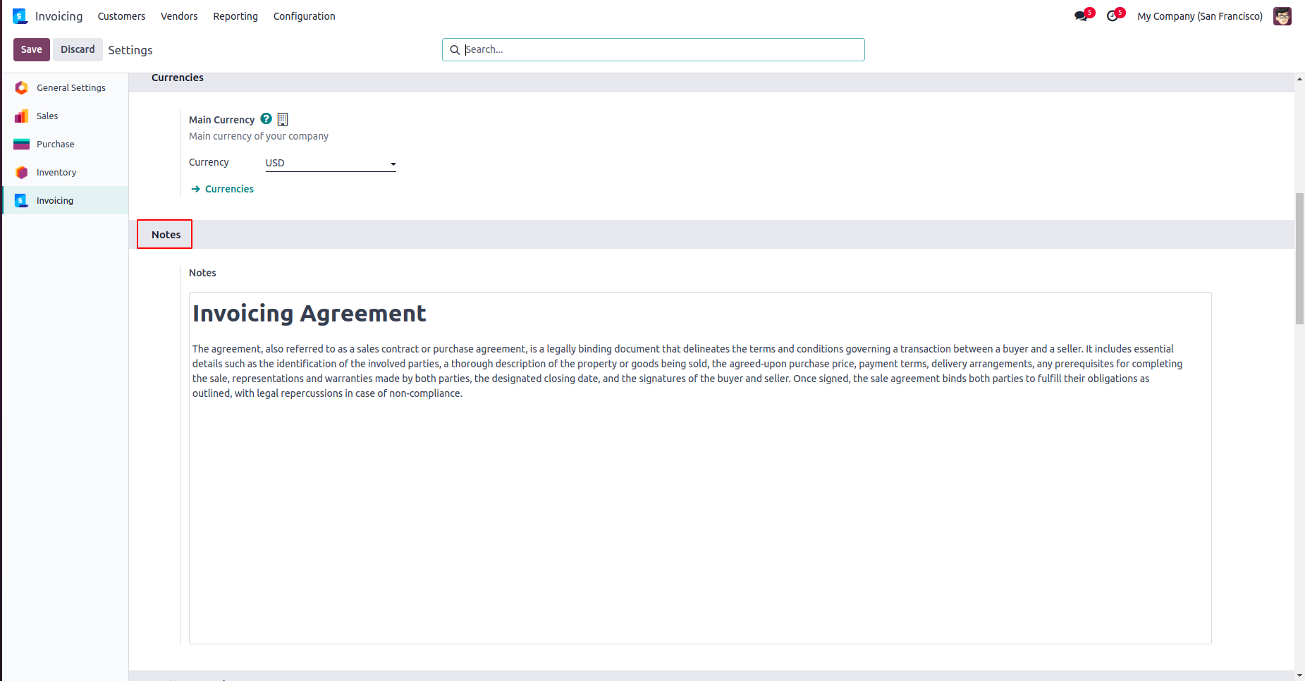 Setup HTML notes in configuration and used this default notes or customized notes in sales,purchase,invoice and inventory form view and also used this notes in reports.