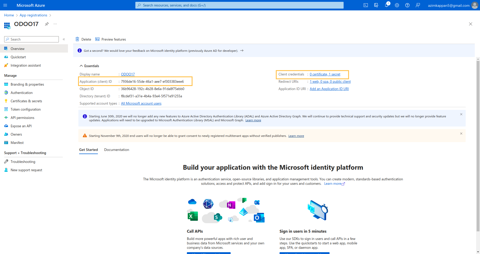 Registering on Microsoft Azure --> app registration will get Application (client) ID and Client credentials