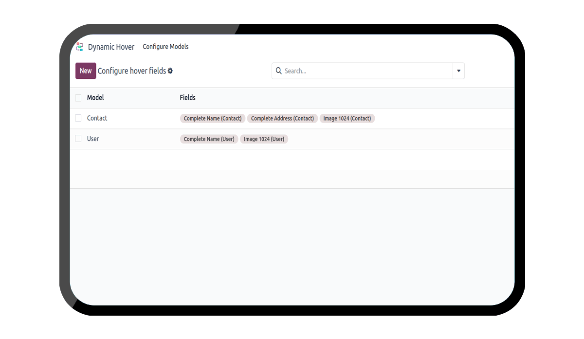 Go to Dynamic Hover -> New -> We can see the fields model and fields to configure.