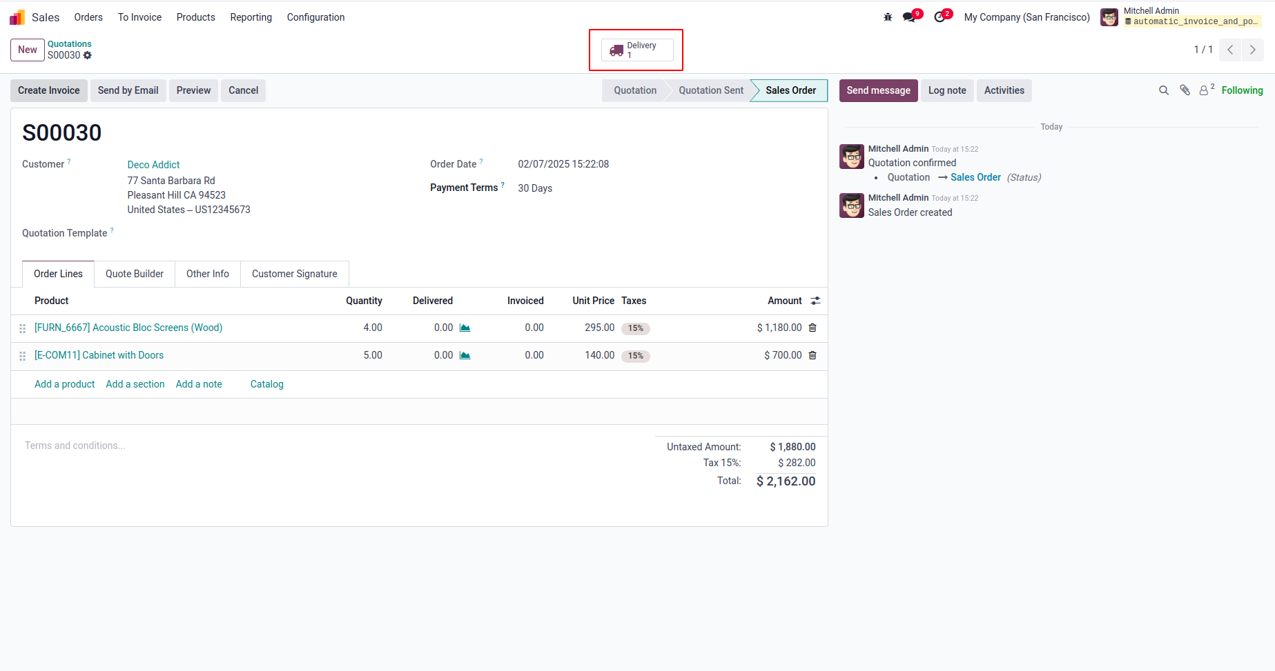 User can see invoice is validated automatically and sent message is linked with chatter which is sent to customer.