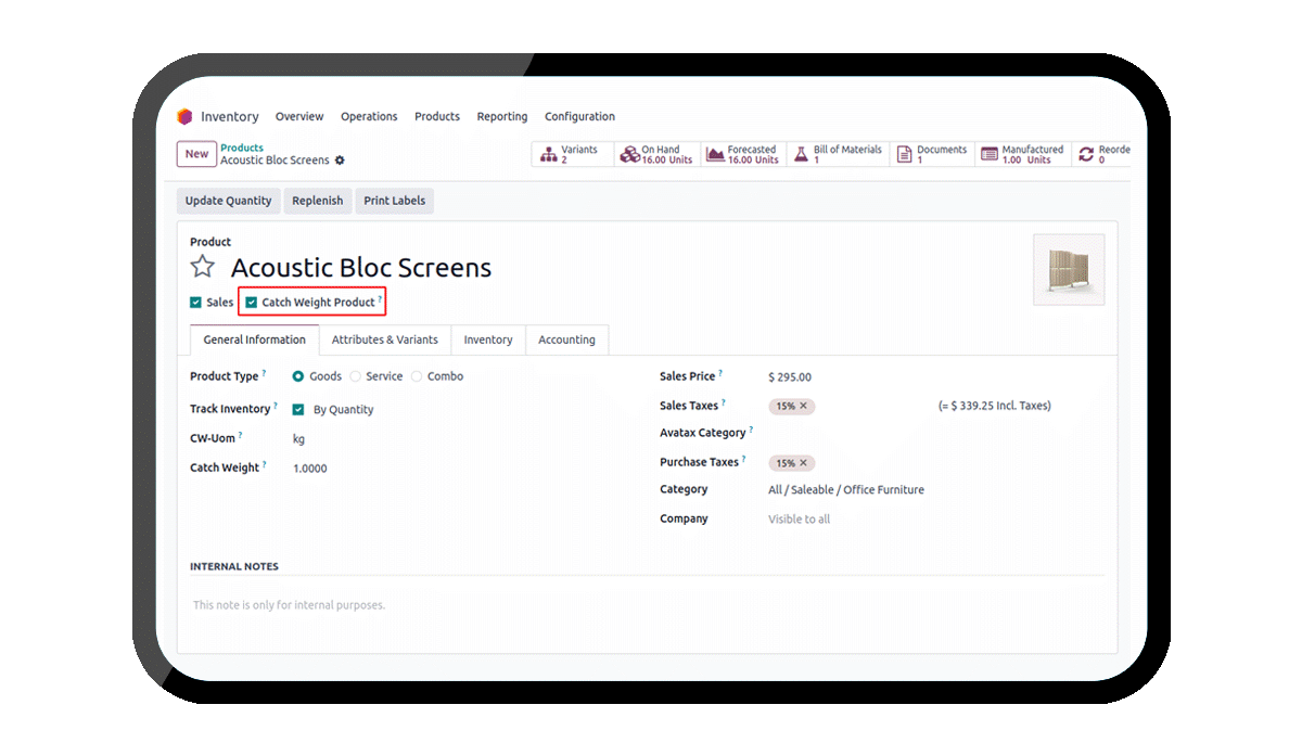 We can set the Catch Weight UOM and weight on each product.