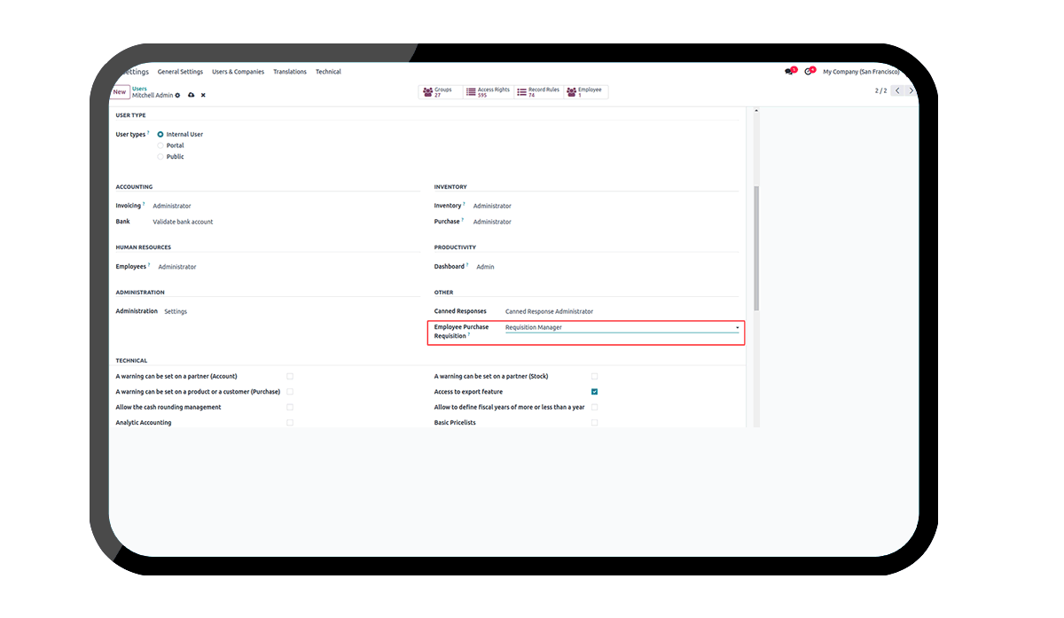 To configure access, navigate to Settings > Users & Companies > Users in Odoo. For a Requisition Manager, set the app access to "Requisition Manager." For Department Heads, assign "Department Head" access for their respective departments. For regular users, select "Requisition User" access. This ensures each role has the appropriate permissions to create, approve, or manage requisitions as needed.