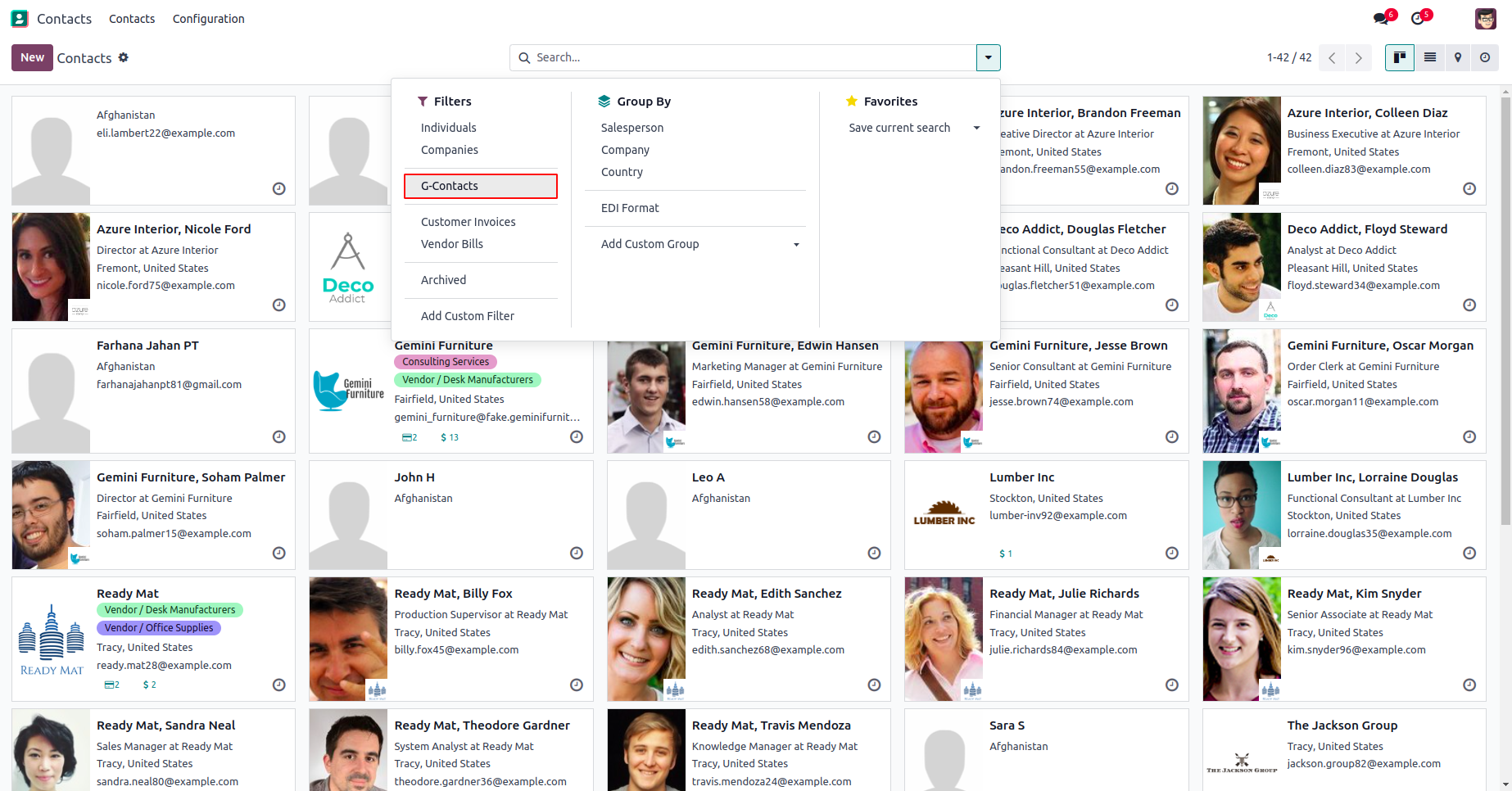 Select the contacts that need to be deleted from both Google and Odoo. Then, click on the 'Delete G-Contact' button. If that contact is associated with another model, it will only be deleted from Google.