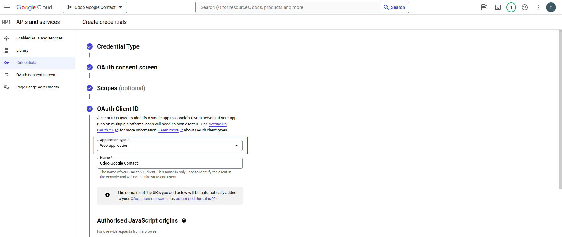 In the Authorized JavaScript Origins section, add your company's Odoo URL. And in the Authorized redirect URIs section, add your company's Odoo URL followed by /google_contact_authentication.