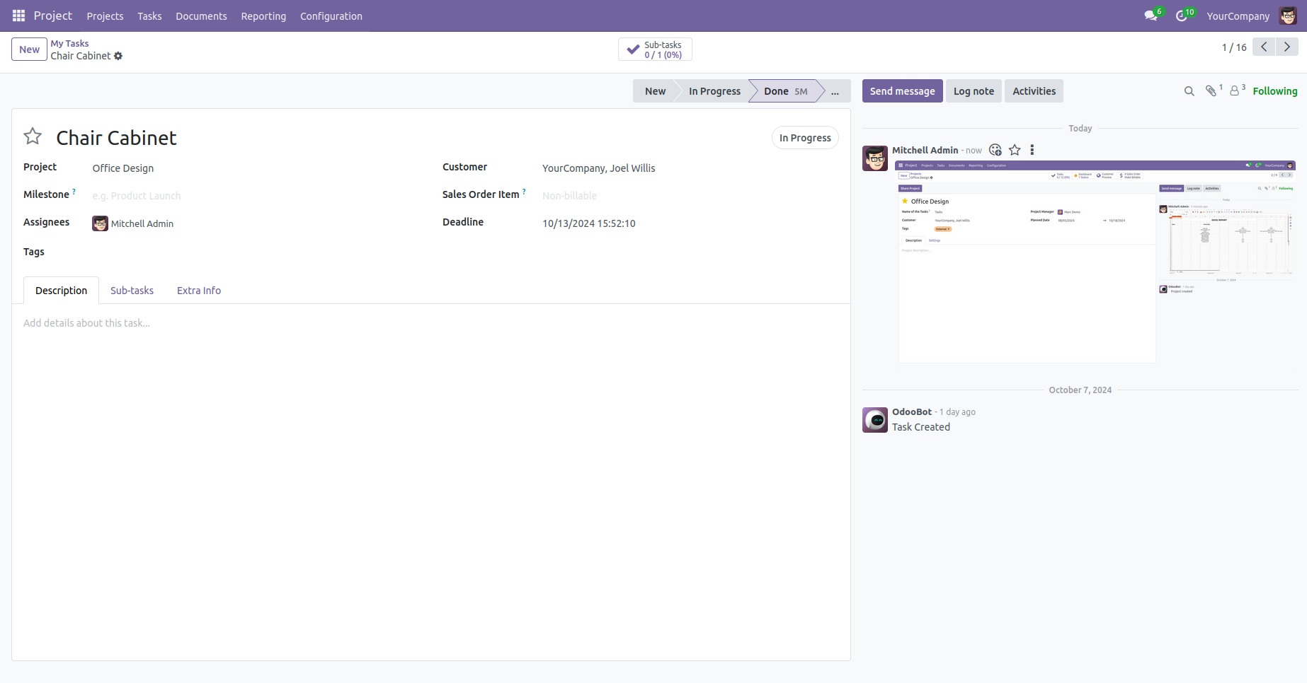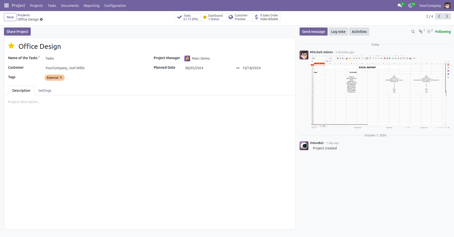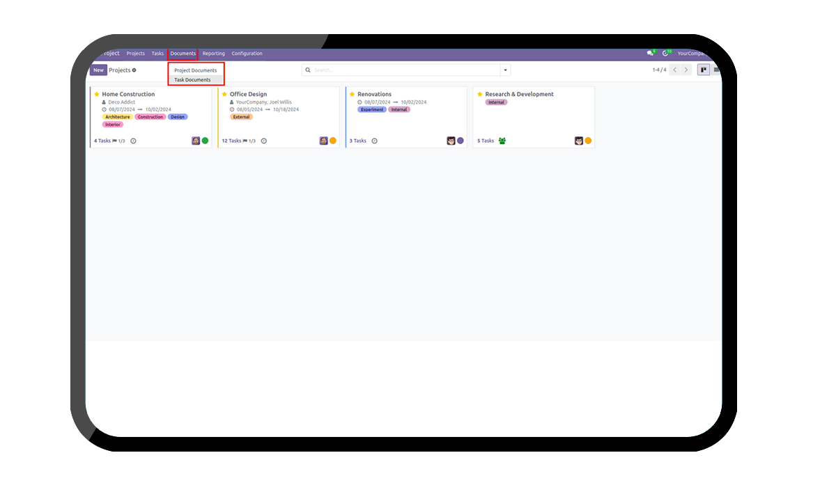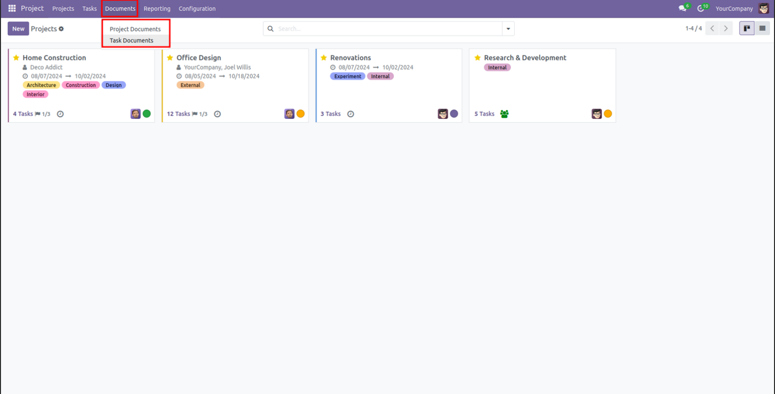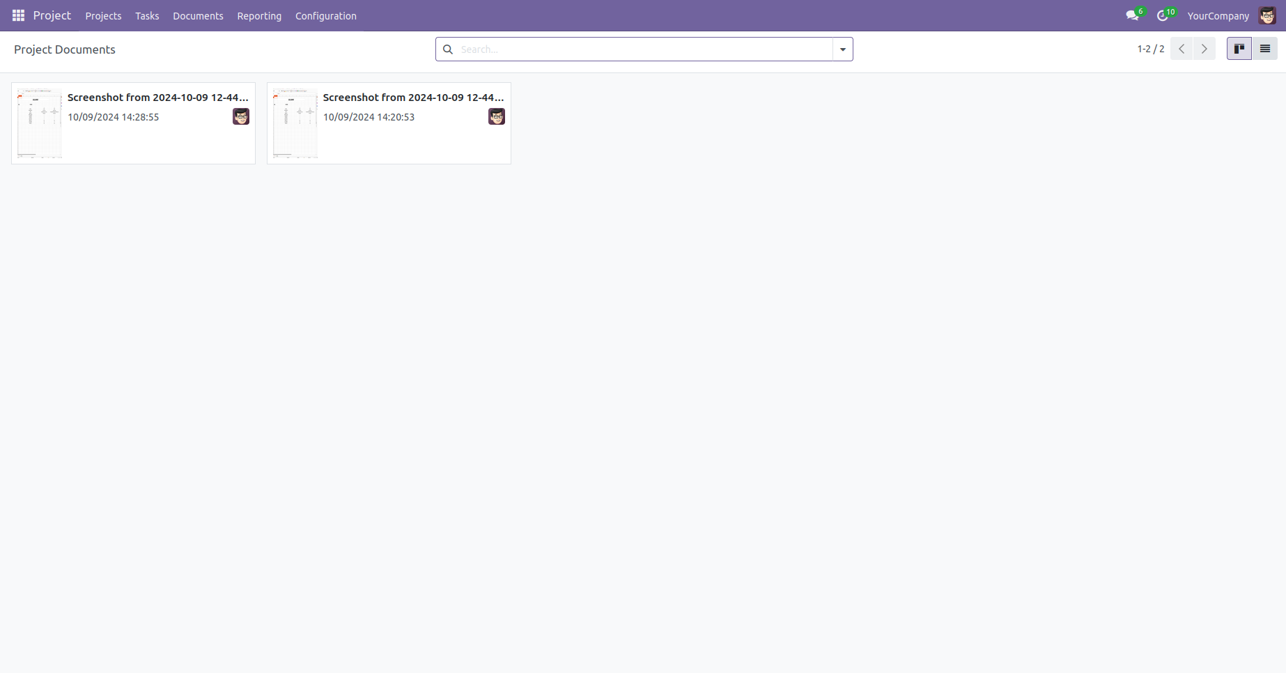 Attached documents are available under a separate menu in the Project module and can also be viewed in the List, Kanban, and Form views.