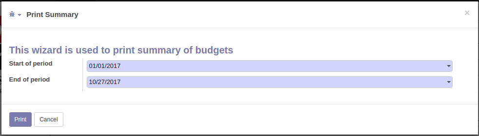 ☑ Option to print budget summary ☑ Option to print budgets ☑ Option to print budgets from analytic accounts ☑ Option to print budgets from budgetary positions