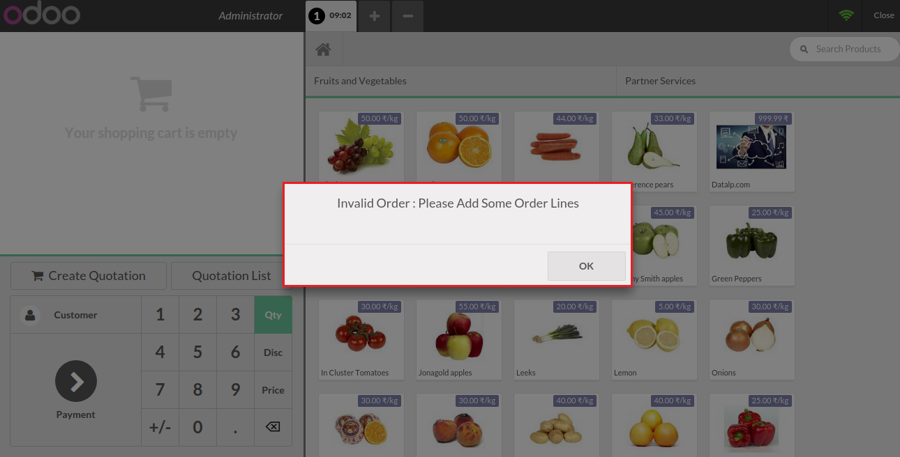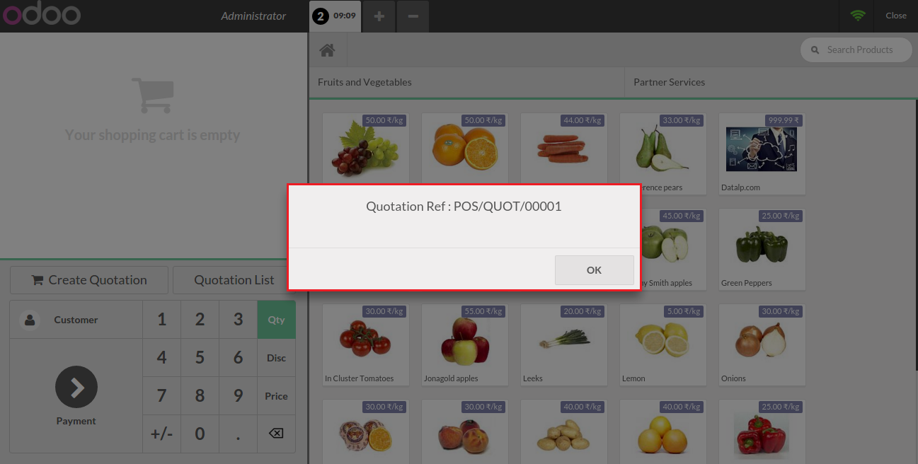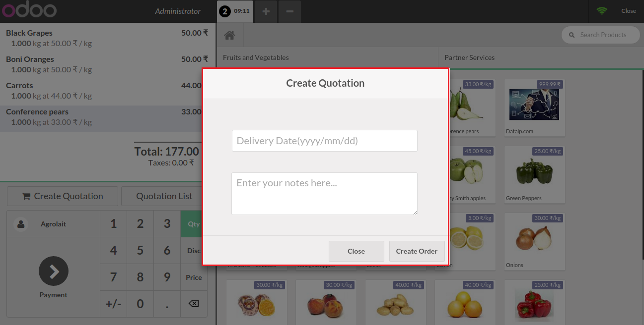 Add the products in order line and click ‘Create Quotation’ it will give you a popup to add order date and a note for quotation.