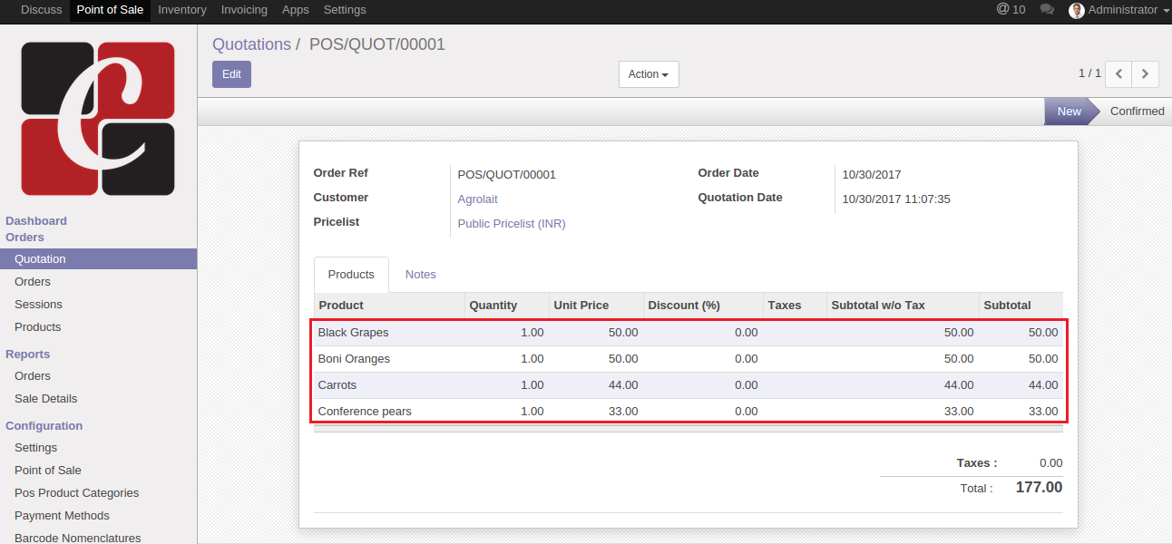 On confirming quotation, you can view the order lines and customer assigned with quotation details.