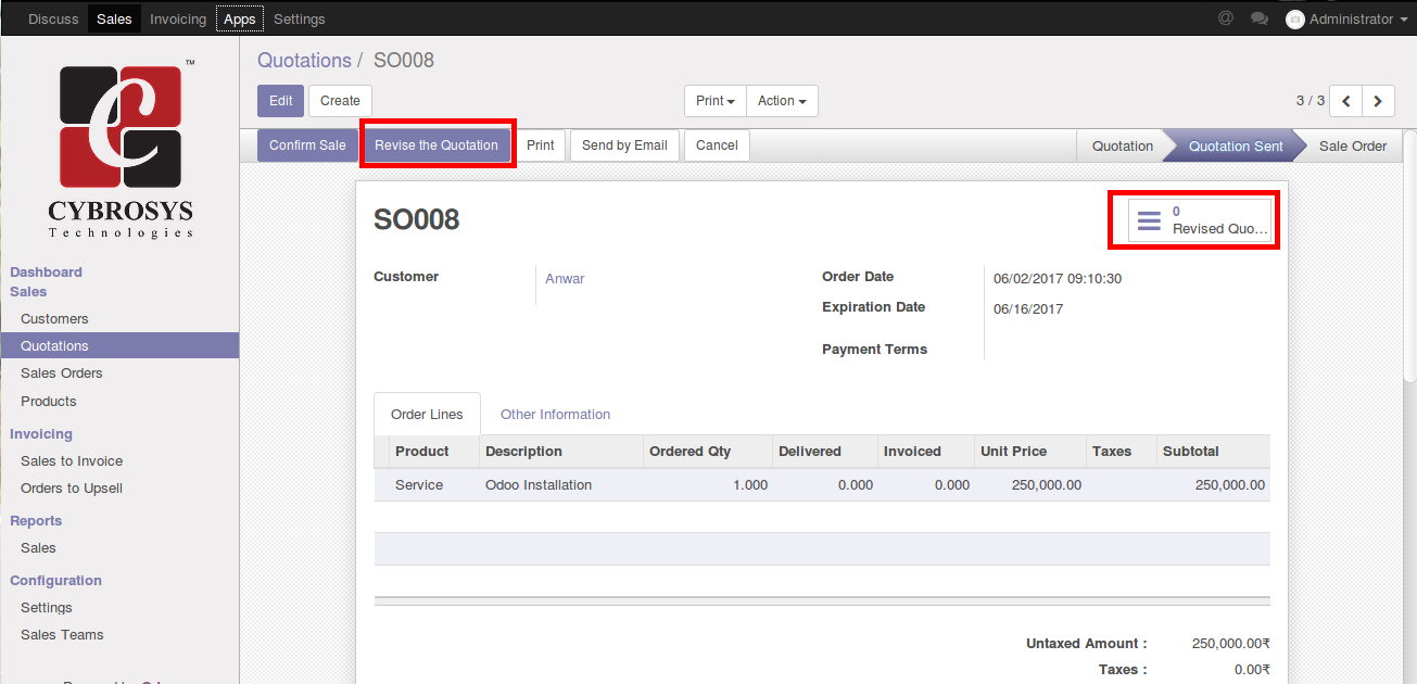 The clients will require negotiations whenever we sent a quotation to them.In such cases we need to edit the Quotation's order lines. We have included the 'Revise the Quotation' button for it. The order lines can be edited by a click on this button. At the same time a history or copy of the quotation will also be generated automatically.We can track the history using the smart buttons.