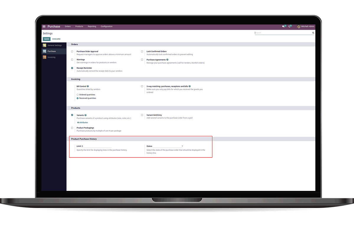 Set Limit and Status [All, RFQ, and Purchase Order] for purchase history. Go to Configuration -> Settings